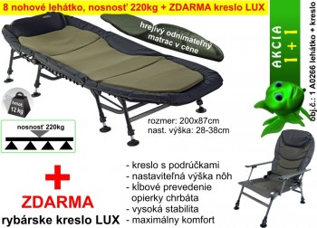 Kaprárske 8 nohové lehátko Enforcer: pevné a pohodlné rybárske lehátko s ôsmimi nohami odopínateľným hrejivý fleece matrac, nosnosť 220 kg + rybásrke poľohovateľné kreslo LUX s opierkami na ruky, polohovateľnou opierkou chrbta, výsuvnými nožičkami.
